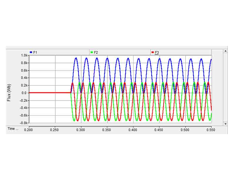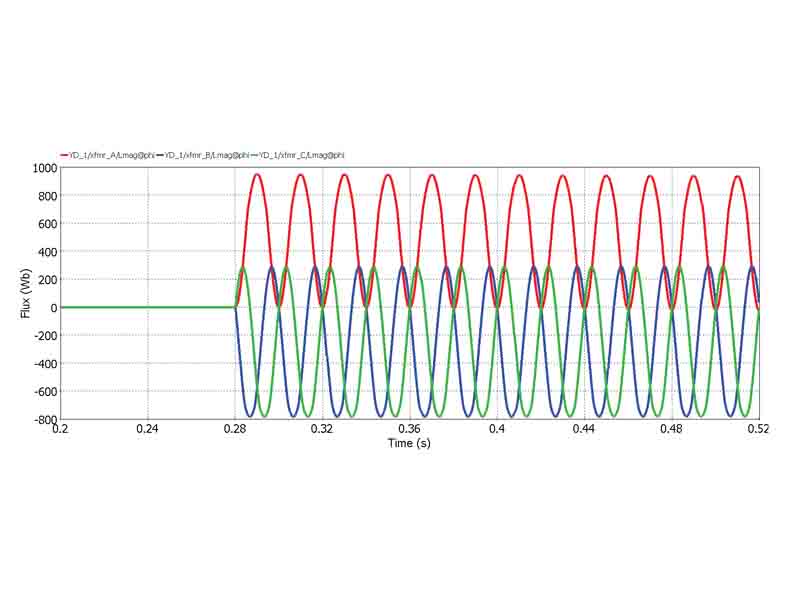 The energization of a power transformer results in a highly transient flux distribution, with high peak magnitudes, and waveform asymmetry as depicted in Fig. 4. The flux profiles are consistent with each other, as evident from Fig. 4(a) and Fig. 4(b).