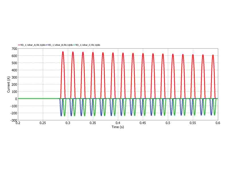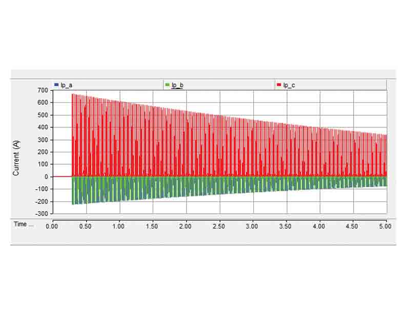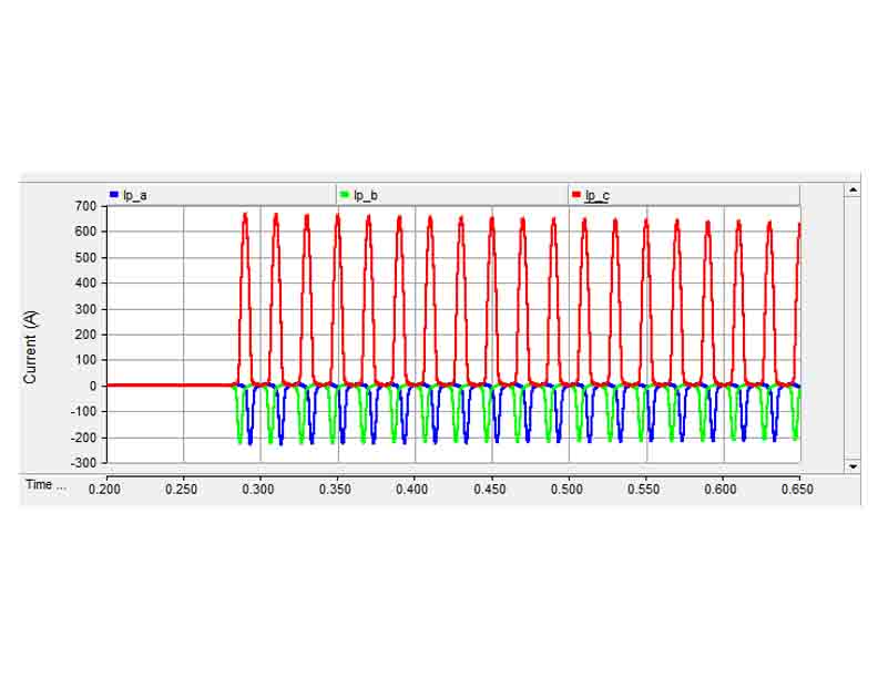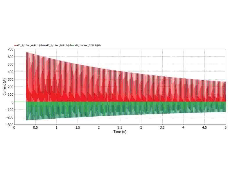 (b) PSCAD-derived transformer inrush current waveform during energization
