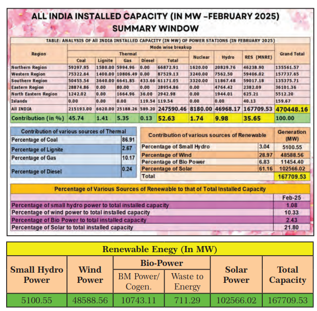 The details of total power generation in India and contribution of various renewable sources with respect to total generation are given in the Table 1 & 2 respectively.